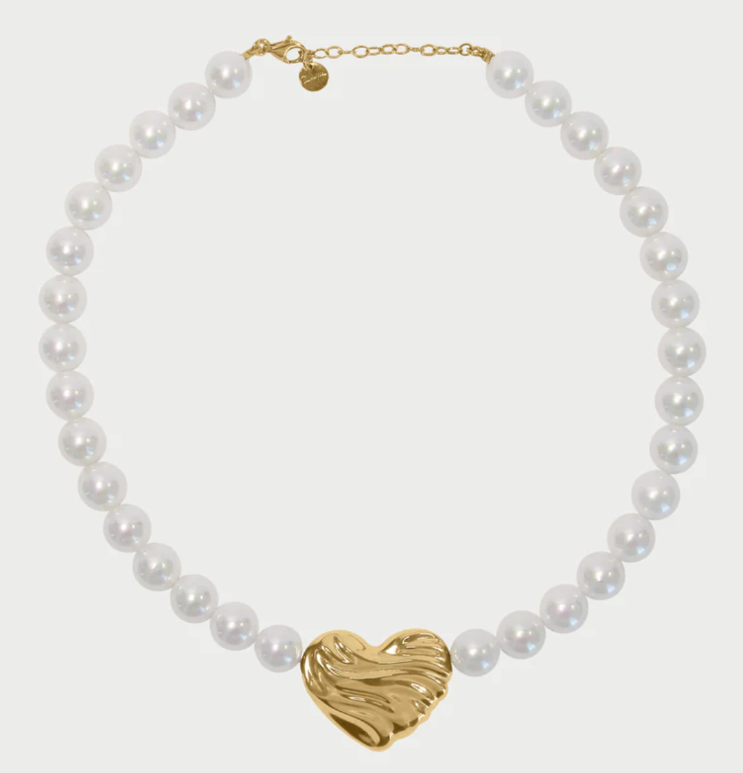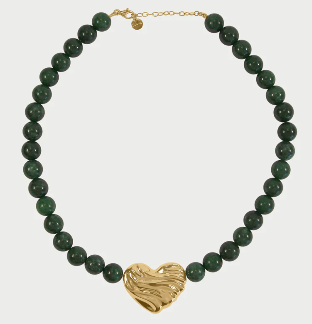 Girocollo con pietre naturali di giada verde scuro/rosa/perle/burgundy e cuore con texture a onda. In lega RDM, finitura oro 18 kt giallo. Raffinato e luminoso.