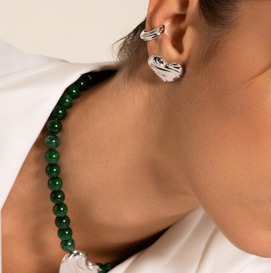 Earcuff con texture a onda in lega RDM, finitura oro 18 kt giallo o rodio. Design moderno e luminoso, non necessita di foro.